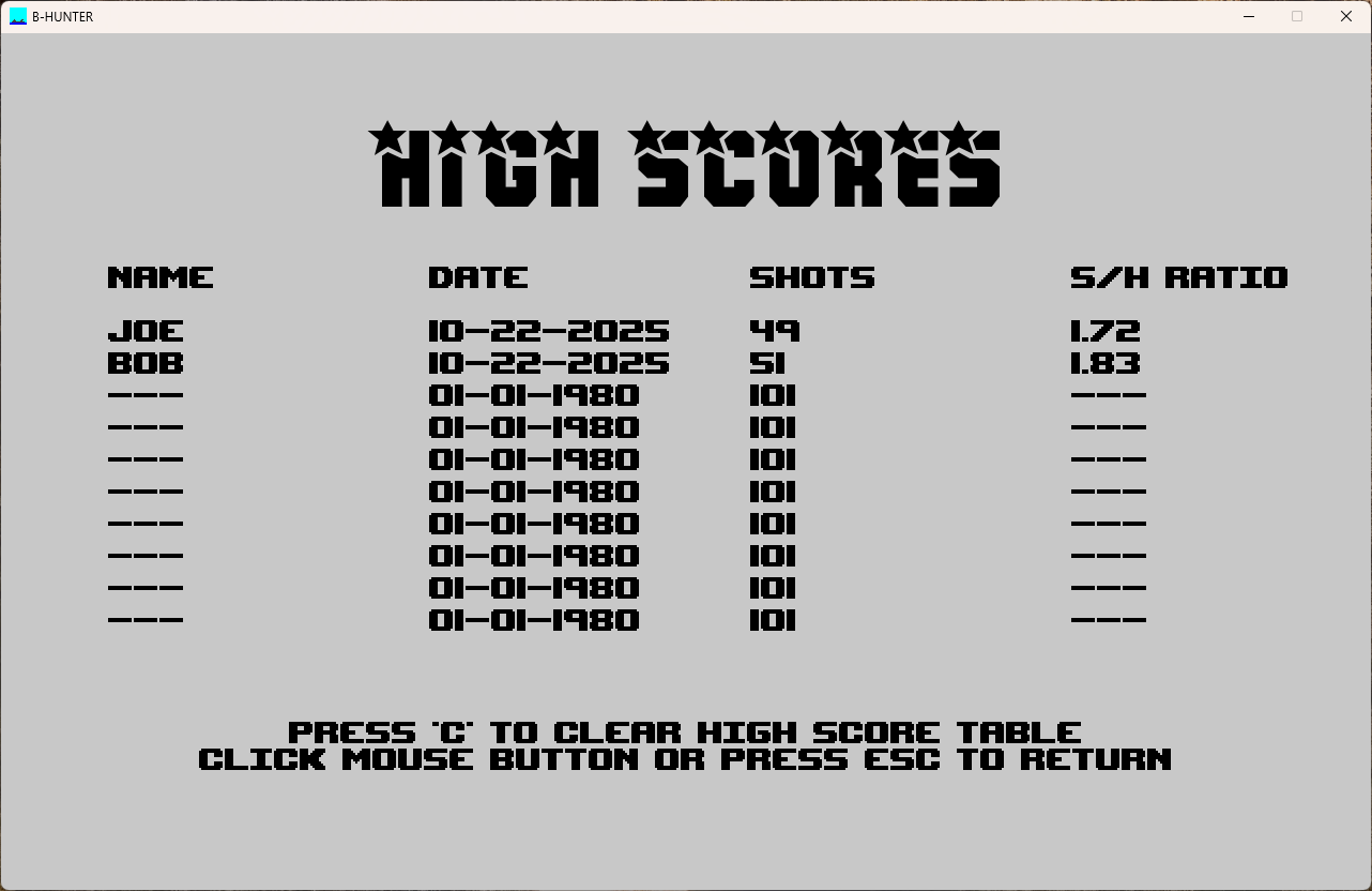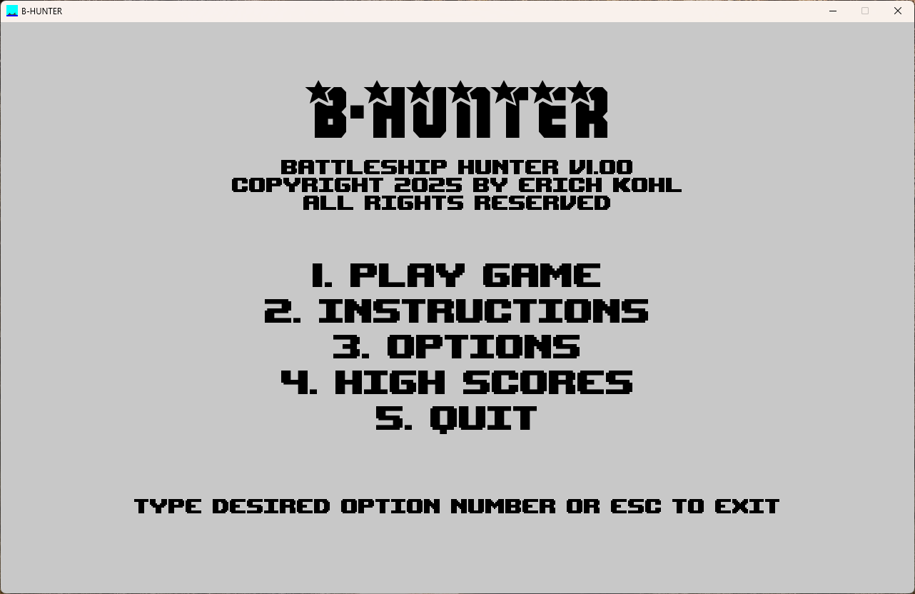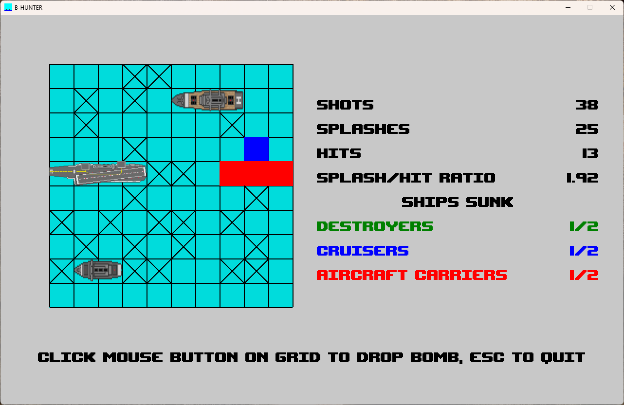 B-HUNTER (short for "Battleship Hunter") is a single-player version of Battleship inspired by a game in the famous book BASIC COMPUTER GAMES by David H. Ahl. All you have to do is sink the six ships in as few shots as possible. The program is very easy to use, has sound effects, and also keeps track of high scores.